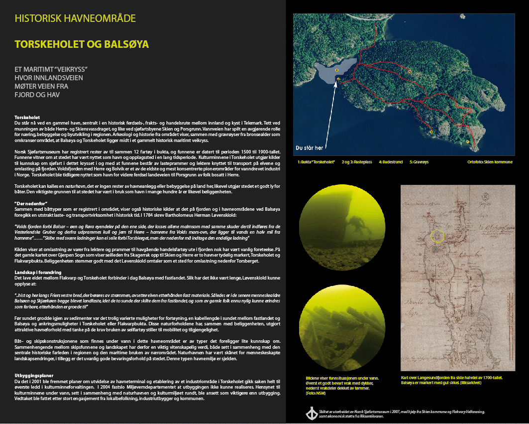 «Da det var besluttet å utbygge distriktet for utvidelse av havneterminal i 2001, ble Torskeholet utpekt som industritomt. Bukta skulle fylles med stein. Under de arkeologiske undersøkelsene ble rester av til sammen 12 fartøy funnet, datert til perioden 1500 til 1900-tallet. Funnene består av lasteprammer og lektere som tidligere var brukt for transport på elvene og omlasting på fjorden til større lastefartøyer. Omlastning av varer fra lektere og prammer til havgående handelsfartøy fortøyet i Flakvarpbukta og Torskeholet var vanlig i seilskutetiden.»( Wikipedia)